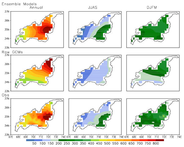 Historical climatology of mean precipitation (mm) (1975–2005) as produced by NEX-GDDP multi-model ensemble (top row), raw GCMs ensemble (middle row), and observed (bottom row)